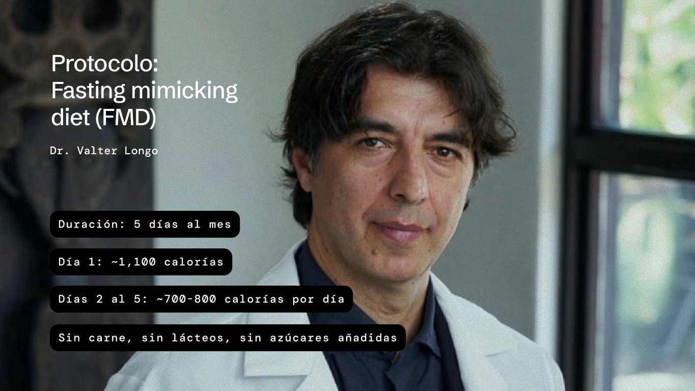 Por qué funciona: La combinación de pocas calorías, poca proteína y pocos azúcares reduce IGF-1 — un factor de crecimiento asociado al envejecimiento — y glucosa en sangre, imitando las señales que activa el ayuno completo. Un ensayo clínico con 100 personas sanas demostró reducciones significativas en grasa abdominal, circunferencia de cintura, presión arterial e IGF-1 — sin pérdida de masa muscular.