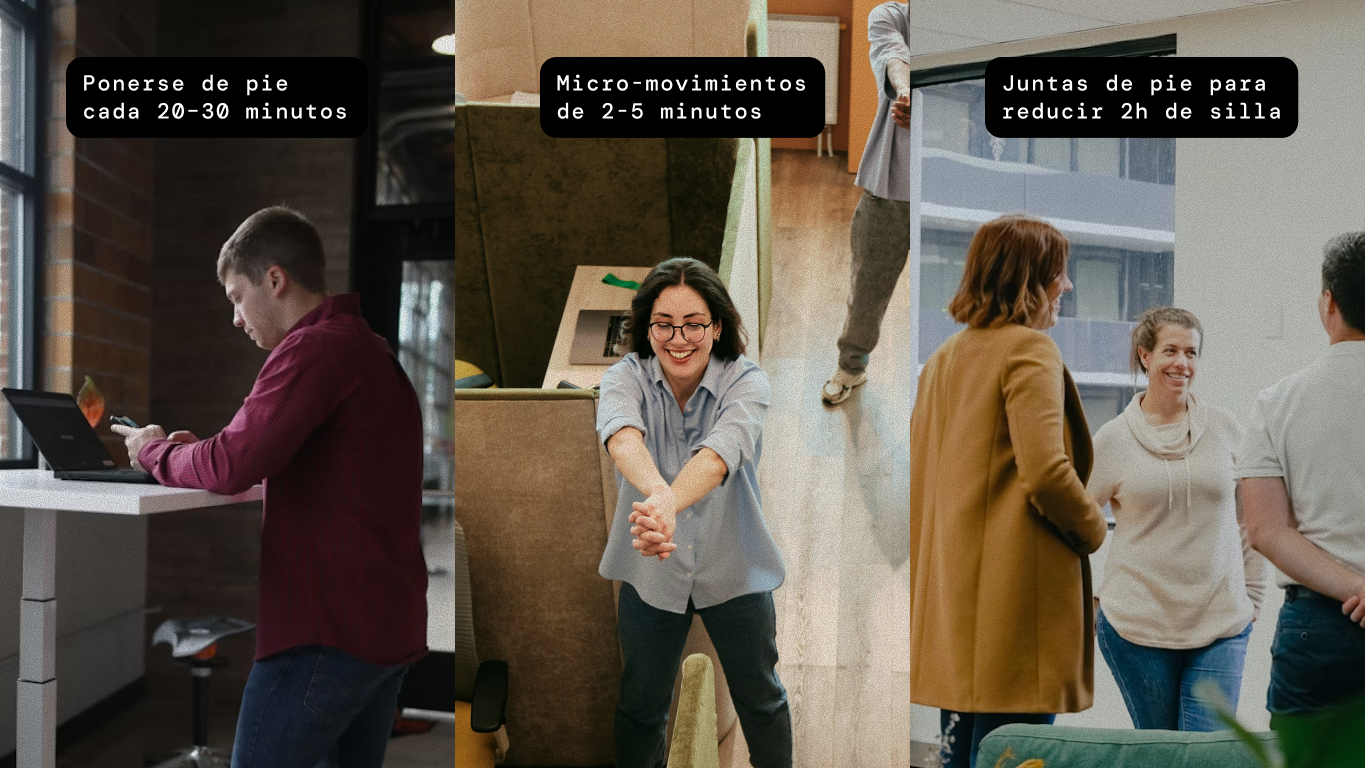 🧑💻 Reducir el tiempo total sentado a 2 horas. Llamadas caminando, juntas de pie, escritorios elevados.
