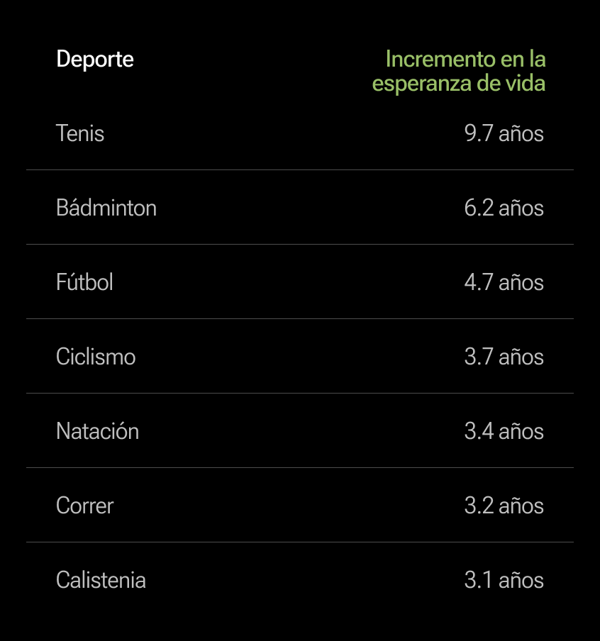 El Copenhagen City Heart Study siguió a más de 8,000 personas durante 25 años para saber qué tipo de ejercicio alarga más la vida. Los resultados mostraron que quienes practicaban deportes de raqueta vivían, en promedio, casi 10 años más. Por encima de nadadores (3.4 años), ciclistas (3.7 años) o quienes hacían calistenia (3.1 años).