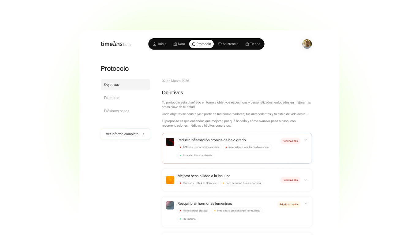 Con los datos de sus biomarcadores y su perfil de salud, nuestro equipo médico, diseñó un protocolo personalizado.