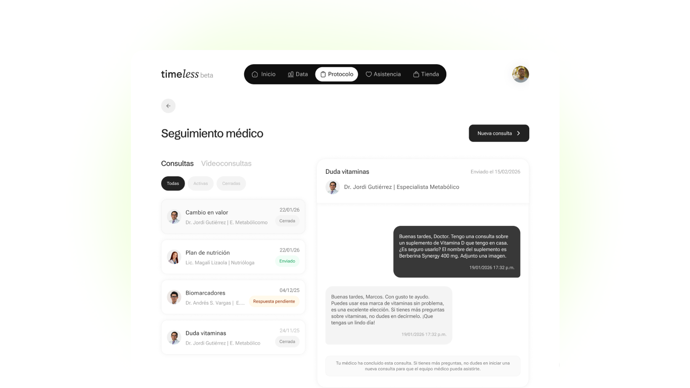 Nuestro objetivo es crear herramientas que faciliten el seguimiento. Timeless IA no diagnostica ni recomienda tratamientos sin validación. Lo entrenamos para saber cuándo responder y cuándo escalar al equipo médico.