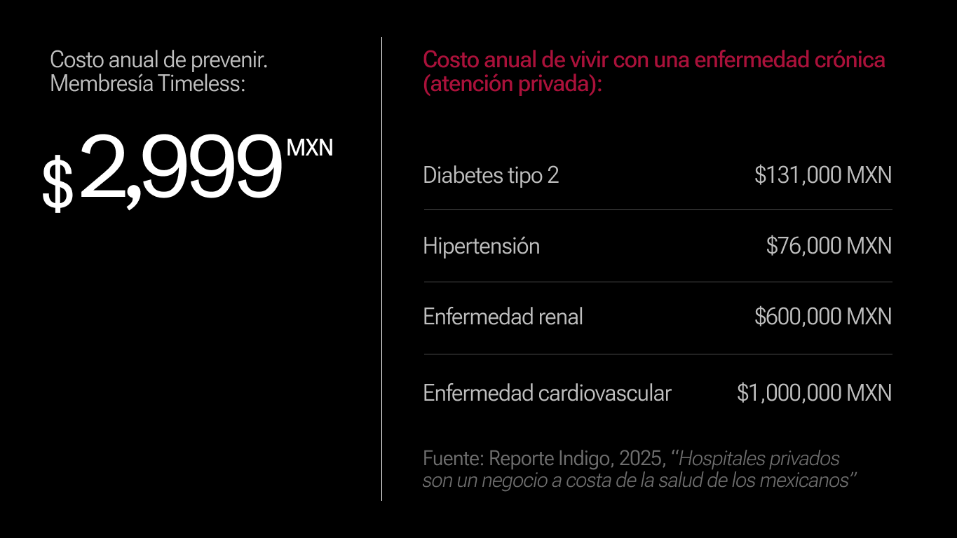Timeless inicia en $250 pesos al mes. Incluso en el escenario más completo de servicios (estudios avanzados, suplementos y medicación incluidos), gastarías menos en 30 años de membresía que en un solo año de enfermedad cardiovascular en el sistema privado.