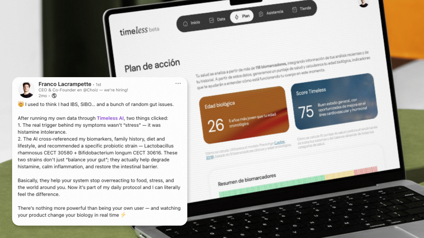 Con este descubrimiento, el soporte médico y Timeless AI, cruzó biomarcadores, antecedentes, dieta y estilo de vida para tomar acción.